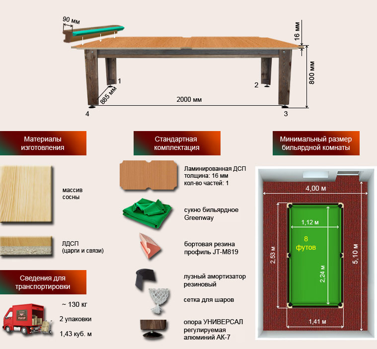 Бильярд может поставляться как в разобранном, так и в собранном виде.