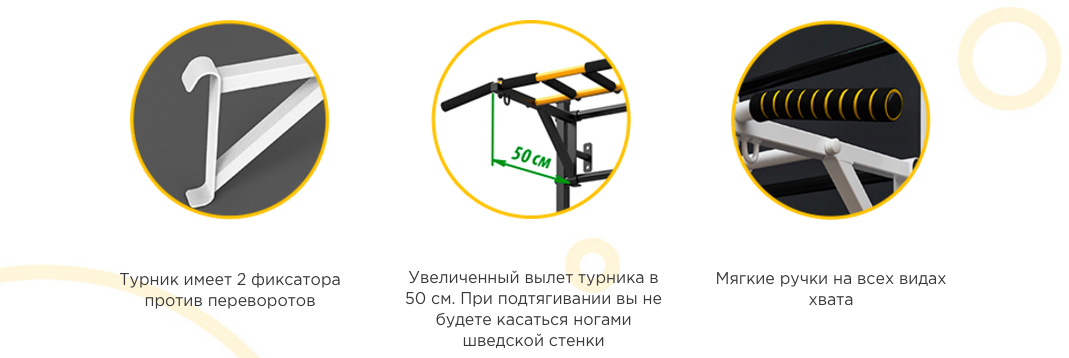 • Надёжная конструкция выполнена из стали, она рассчитана на массу до 250 кг. Турник имеет идеальный вылет перекладины - на 57 см от стены. Такое расстояние позволяет не дотрагиваться до снаряда ногами при выполнении отдельных упражнений, требующих смещения корпуса вперёд. Увеличенный на 10 см вылет перекладины дал новые возможности — благодаря такому решению на боковинах появилось место для детской навески (гимнастических колец и веревочной лестницы). Есть и канат, он закреплен на срединной перемычке.