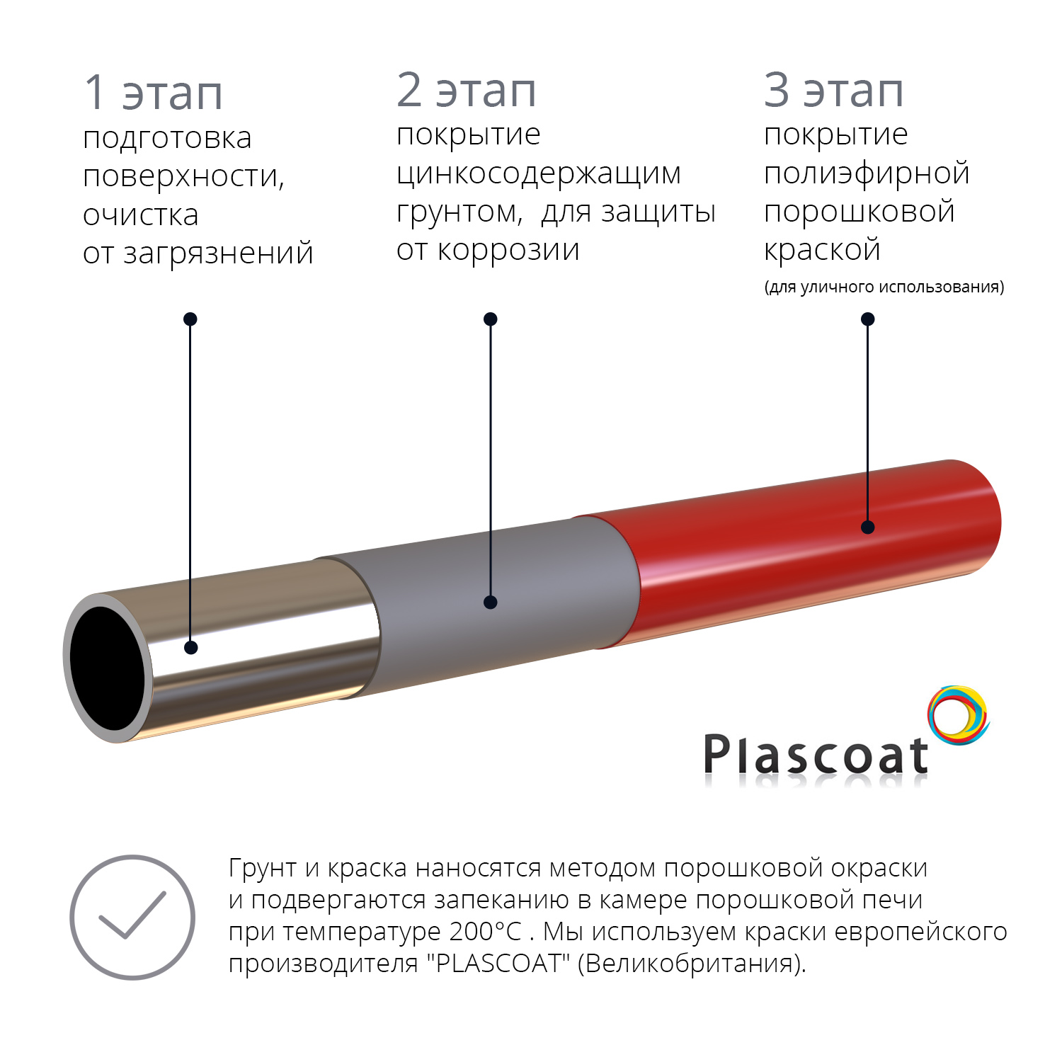 Все металлические части тренажеров имеют двухслойную окраску: 1) Первый слой - это цинкосодержащий грунт, который наносится на тщательно подготовленную поверхность и обеспечивает дополнительную защиту от коррозии; 2) Второй слой - финишное покрытие полиэфирной порошковой краской (для уличного использования). Оба слоя наносятся методом порошковой окраски и подвергаются запеканию в камере порошковой печи при температуре 200°C . Мы используем краски европейского производителя "PLASCOAT" (Великобритания).